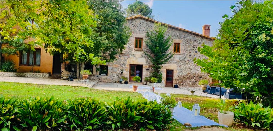 Masía catalana restaurada con amplios jardines, piedra original y un aire íntimo y natural.